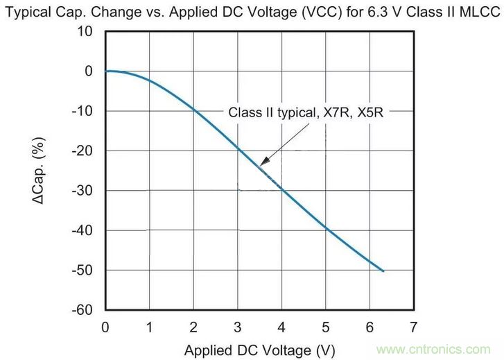 用于替換最可能的MLCC候選者采用“II類”電介質(zhì)材料。這種II類陶瓷(通常為X7R或X5R)的容值會(huì)在溫度范圍內(nèi)變化,這種特征稱為電容溫度系數(shù)(TCC),參見(jiàn)圖1。