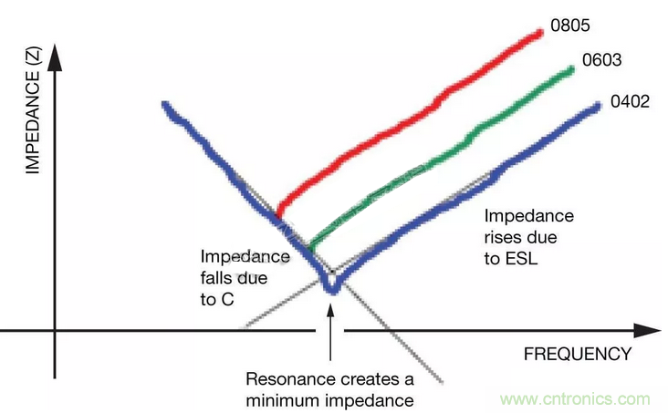 高速電路是一個(gè)例外,其中的感應(yīng)負(fù)載可能會(huì)延遲傳送來(lái)自電容的所需電流,從而影響電路性能。阻抗(Z)的影響因外殼尺寸而有不同,如圖4所示。