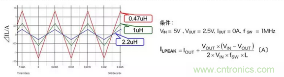 在這里,為加深對(duì)電感工作的理解,進(jìn)一步說(shuō)明電感值變化時(shí)電感電流如何變化的情形。下圖表示在相同工作條件下將電感值設(shè)為0.4μH、1μH、2.2μH時(shí)ILPEAK。