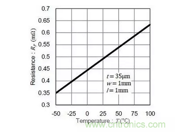 此外,如果知道每單位面積銅的電阻值Rp在不同溫度下的變化(如下圖資料所示),可以使用以下公式估算整個(gè)銅的電阻值R。注意下圖銅的尺寸是:厚度(t)35μm,寬度(w)1mm,長(zhǎng)度(?)1mm。