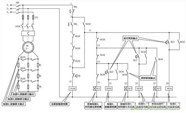 轉(zhuǎn)子回路中的3組啟動電阻,由接觸器2KM、3KM、4KM在時間繼電器1KT、2KT、KT3的控制下被順序短接;在正常工作時,只有接觸器1KM和2KM的主觸點閉合。