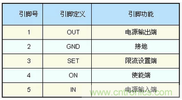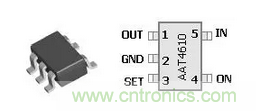 我們?nèi)砸訟AT4610為例,說明電子開關(guān)實(shí)現(xiàn)過流保護(hù)的工作原理。AAT4610采用SOT-23塑料封裝(如圖1),5個引腳的定義見表1。