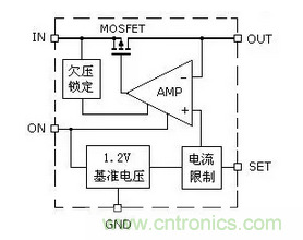 AAT4610將6V/2A的P溝道MOSFET場效應(yīng)管與柵極驅(qū)動器、電壓基準(zhǔn)、限流比較器和欠壓閉鎖電路組合在SOT-23-5封裝中(如圖2)。其中MOSFET是一個電子開關(guān),它的通斷受比較器輸出電壓的控制,如果輸出電流大于設(shè)定電流,運(yùn)算放大器AMP輸出負(fù)電壓,關(guān)斷MOSFET,停止電壓輸出,對供電電路起到保護(hù)作用。MOSFET的溝道電阻最大值僅為180mΩ,關(guān)斷模式下靜態(tài)電流為1mA。MOSFET的工作電壓為2.7V~5.5V,輸入電壓低于2.7V時,由欠壓鎖定電路關(guān)斷MOSFET,對供電電路進(jìn)行欠壓保護(hù)。