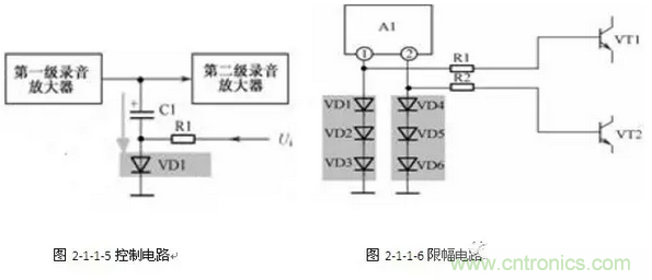 二極管導(dǎo)通之后,它的正向電阻大小隨電流大小變化而有微小改變,正向電流愈大,正向電阻愈??;反之則大。利用二極管正向電流與正向電阻之間的特性,可以構(gòu)成一些自動控制電路。如圖9-43所示是一種由二極管構(gòu)成的自動控制電路,又稱ALC電路(自動電平控制電路),它在磁性錄音設(shè)備中(如卡座)的錄音電路中經(jīng)常應(yīng)用。圖2-1-1-5。