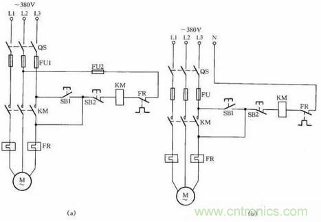接觸器線圈電壓為380V時,可按圖12(a)所示接線;接觸器線圈電壓為220V時,可按圖12(b)接線。圖12(a)的接線還有缺陷,即在電動機(jī)停轉(zhuǎn)時,其引出線及電動機(jī)帶電,使維修不大安全。因此,這種線路只能在應(yīng)急時采用,并在維修電動機(jī)時,應(yīng)斷開控制電動機(jī)的總電源開關(guān)QS,這一點應(yīng)特別注意。