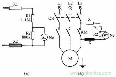 如果絕緣電阻合乎標(biāo)準(zhǔn)(即絕緣電阻值大于0.5MΩ),則泄漏電流很小時,在R2上的電壓降小于氖泡的點燃電壓,Ne不亮;當(dāng)任意兩相或三相同時對機(jī)殼的絕緣電阻降低時,泄漏電流大增,使氖泡Ne點燃,從而可判定絕緣不合格。