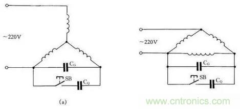 如圖19所示:圖(a)為Y形接法電動機(jī)連接方法,圖(b)為△形接法電動機(jī)連接方法。為了提高啟動轉(zhuǎn)矩,將啟動電容CQ在啟動時接入線路中,在啟動完畢后退出。