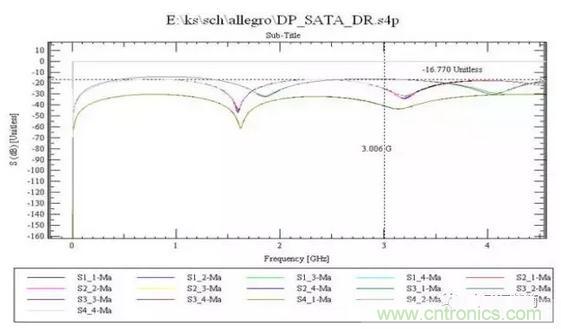 以上的相關(guān)步驟設(shè)置好以后就可以進行仿真了,allegro可以進行信號的反射仿真、串?dāng)_仿真,差分線還要進行眼圖分析。當(dāng)然仿真也分前仿真和后仿真,在利用allegro進行PCB設(shè)計的時候還需要結(jié)合仿真的結(jié)果實時的對設(shè)計進行修改以達(dá)到符合要求的目的。由于仿真過程復(fù)雜,步驟繁瑣,在此不一一進行描述, 差分對的布線有兩點要注意,一是兩條線的長度要盡量一樣長,等長是為了保證兩個差分信號時刻保持相反極性,減少共模分量。另一是兩線的間距(此間距由差分阻抗決定)要一直保持不變,也就是要保持平行。平行的方式有兩種,一為兩條線走在同一走線層(side-by-side),一為兩條線走在上下相鄰兩層(over-under)。一般以前者side-by-side 實現(xiàn)的方式較多。等距則主要是為了保證兩者差分阻抗一致,減少反射。對差分對的布線方式應(yīng)該要適當(dāng)?shù)目拷移叫?。所謂適當(dāng)?shù)目拷且驗檫@間距會影響到差分阻抗(differential impedance)的值, 此值是設(shè)計差分對的重要參數(shù)。需要平行也是因為要保持差分阻抗的一致性。若兩線忽遠(yuǎn)忽近, 差分阻抗就會不一致, 就會影響信號完整性(signal integrity)及時間延遲(timing delay)。從仿真的S參數(shù)曲線圖可以分析差分對的差分阻抗(differential impedance),以及信號完整性。下面給出本設(shè)計中的關(guān)鍵信號仿真波形以供加以說明。 從仿真圖例圖5看到,S11在0-3.0GHz 的頻域范圍內(nèi)其最劣化的指標(biāo)為:-16.770db以下 ,S22(粉紅色的曲線)也不劣于-17db。 這說明該差分對的差分阻抗(differential impedance)接近設(shè)計指標(biāo),信號完整性得到了保證。