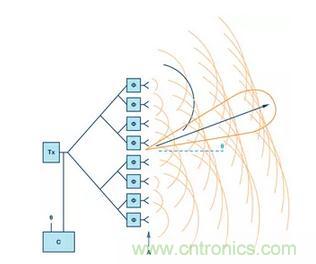 圖1展示了如何通過調(diào)整每個天線中信號的相位,將有效波束控制在線性陣列的目標方向上。結(jié)果,陣列中的每個天線都具有獨立的相位和幅度設(shè)置,以形成期望的輻射圖。由于沒有機械運動部件,所以很容易理解相控陣中波束快速轉(zhuǎn)向的屬性。