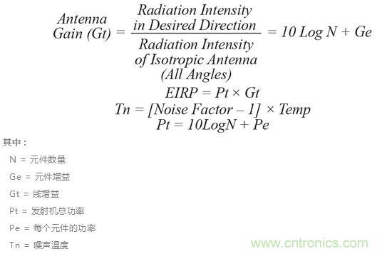在設(shè)計時要考慮陣列大小與每個輻射元件的功率之間的權(quán)衡關(guān)系,這些元件會影響波束的方向性和有效輻射功率??梢酝ㄟ^考察一些常見的品質(zhì)因數(shù)來預(yù)測天線的性能。通常,天線設(shè)計人員會考察天線增益、有效各向輻射功率 (EIRP) 及Gt/Tn。有一些基礎(chǔ)等式可用于描述以下等式中所示的這些參數(shù)。我們可以看到,天線增益和EIRP與陣列中元件的數(shù)量成正比。這可能導(dǎo)致地面雷達應(yīng)用中常見的大型陣列。