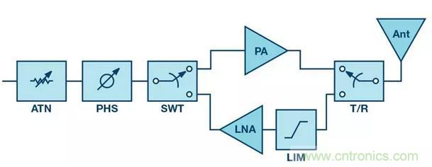 它們包括一個用于調(diào)整每個天線元件相位(最終控制天線)的移相器、一個可以使波束逐漸變細的衰減器、一個用于傳輸信號的功率放大器和一個用于接收信號的低噪聲放大器,另有一個用于在發(fā)射與接收之間切換的開關(guān)。在過去的實施方案中,這些IC中的每一個都可能放在5mm×5mm的封裝中,更先進的解決方案則可能用集成式單片單通道GaAs IC來實現(xiàn)該功能。