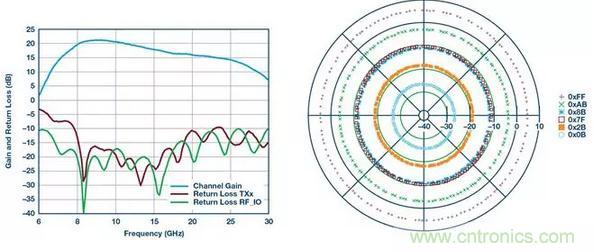 圖5顯示了具有全360°相位覆蓋的增益和相位控制,可以實現(xiàn)小于2.8°的相位步長和優(yōu)于31 dB的增益控制。ADAR1000集成片上存儲器,可存儲多達121個波束狀態(tài),其中一個狀態(tài)包含整個IC的所有相位和增益設(shè)置。發(fā)射器提供大約19 dB的增益和15 dBm的飽和功率,其中接收增益約為14 dB。另一個關(guān)鍵指標是增益控制的相位變化,其在20 dB范圍內(nèi)約為3°。同樣,在整個360°相位覆蓋范圍內(nèi),相位控制的增益變化約為0.25 dB,緩解了校準難題。