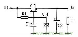 R1 同時還是 VD1 的限流保護電阻。在加入穩(wěn)壓二 極管 VD1 后,改變 R1 的大小不能改變 VT1 發(fā)射極輸出電壓大小,由于 VT1 的發(fā)射結(jié)存在 PN結(jié)電壓降,所以 發(fā)射極輸出電壓比 VD1 的穩(wěn)壓值略小。