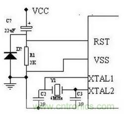 在內(nèi)部方式時鐘電路中,必須在XTAL1和XTAL2引腳兩端跨接石英晶體振蕩器和兩個微調(diào)電容構(gòu)成振蕩電路,通常C1和C2一般取30pF,晶振的頻率取值在1.2MHz~12MHz之間。對于外接時鐘電路,要求XTAL1接地,XTAL2腳接外部時鐘,對于外部時鐘信號并無特殊要求,只要保證一定的脈沖寬度,時鐘頻率低于12MHz即可。