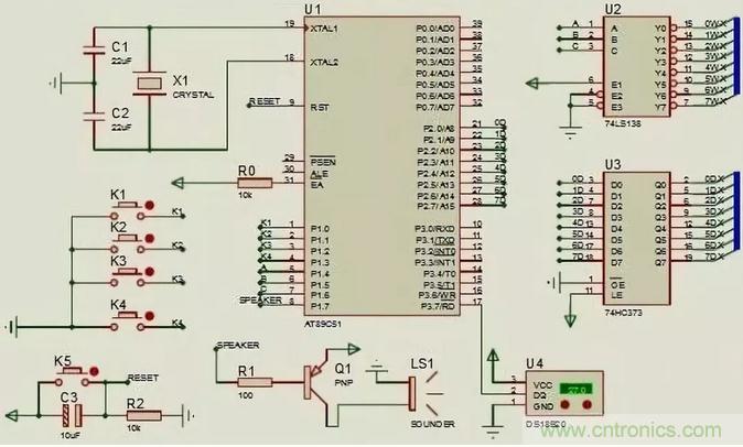 當按1次K3進入鬧鐘設(shè)置界面,時鐘繼續(xù)進行走時,按K2對秒進行設(shè)置;當按2次K3,按K2對分進行設(shè)置;當按3次K3,按K2對秒進行設(shè)置;當按下4次K3時,鬧鐘設(shè)置完畢進入時鐘顯示界面。電路圖如下: