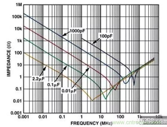 并聯(lián)不同電容值的電容器有助于確保電源引腳在很寬的頻帶上出現(xiàn)很低的交流(AC)阻抗。這對(duì)于在運(yùn)算放大器電源抑制比(PSR)衰減頻率處尤其重要。該電容器有助于補(bǔ)償放大器降低的PSR。在許多十倍頻程范圍內(nèi)保持低阻抗的接地通路將有助于確保有害的雜訊不能進(jìn)入運(yùn)算放大器。(圖一)顯示採(cǎi)用多個(gè)并聯(lián)電容器的優(yōu)點(diǎn)。在低頻段,大的電容器提供低阻抗的接地通路。但是一旦頻率達(dá)到了它們自身的諧振頻率,電容器的相容性就會(huì)減弱,并且逐漸呈現(xiàn)出電感性。這就是為什么採(cǎi)用多個(gè)電容器是很重要的原因:當(dāng)一個(gè)電容器的頻率回應(yīng)開始下降時(shí),另一個(gè)電容器的頻率回應(yīng)開始其作用,所以能在許多十倍頻程范圍內(nèi)保持很低的AC阻抗。
