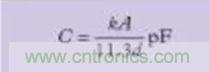 當(dāng)尋找有問題的寄生源時(shí),可能用得著幾個(gè)計(jì)算上述那些寄生電容尺寸的基本公式。(公式一)是計(jì)算平行極板電容器的公式,如(圖五)。