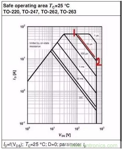 此圖中:當VDS=1V時,Y軸對應的ID為2A,Rds=VDS/ID=0.5R ==>Tj=150℃時,Rds(on)約為0.5R.當VDS=10V時,Y軸對應的ID為20A,Rds=VDS/ID=0.5R ==>Tj=150℃時,Rds(on)約為0.5R.所以,此部分曲線中,SOA表現(xiàn)為Tj_max時RDS(on)的限制.