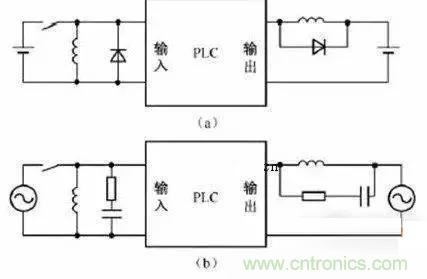 當(dāng)PLC輸入輸出端接有感性負(fù)載元件時,直流輸出的續(xù)流管保護(hù)(直流電路兩端并聯(lián)續(xù)流二極管),交流輸出阻容吸收電路。