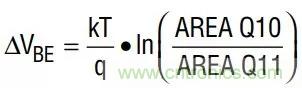 基本帶隙基準(zhǔn)電壓源背后的數(shù)學(xué)原理很有意思,因為它將已知溫度系數(shù)與獨特的電阻率相結(jié)合,產(chǎn)生理論上溫度漂移為零的基準(zhǔn)電壓。圖5顯示了兩個晶體管,經(jīng)調(diào)整后,Q10的發(fā)射極面積為Q11的10倍,而Q12和Q13的集電極電流保持相等。這就在兩個晶體管的基極之間產(chǎn)生一個已知電壓: