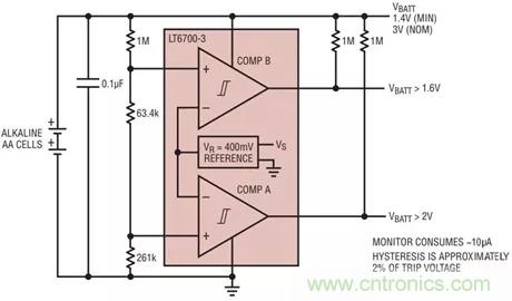 LT6700(圖7)和LT6703是集成度更高的解決方案,其將400mV基準(zhǔn)電壓源與比較器相結(jié)合,可用作電壓監(jiān)控器或窗口比較器。400mV基準(zhǔn)電壓源可以監(jiān)控小輸入信號,從而降低監(jiān)控電路的復(fù)雜性;它還能監(jiān)控采用非常低電源電壓工作的電路元件。如果閾值較大,可以添加一個簡單的電阻分壓器(圖8)。這些產(chǎn)品均采用小尺寸封裝(SOT23),功耗很低(低于 10μA),支持寬電源范圍 (1.4V 至 18V)。此外,LT6700 提供 2mm x 3mm DFN 封裝,LT6703 提供 2mm x 2mm DFN 封裝。
