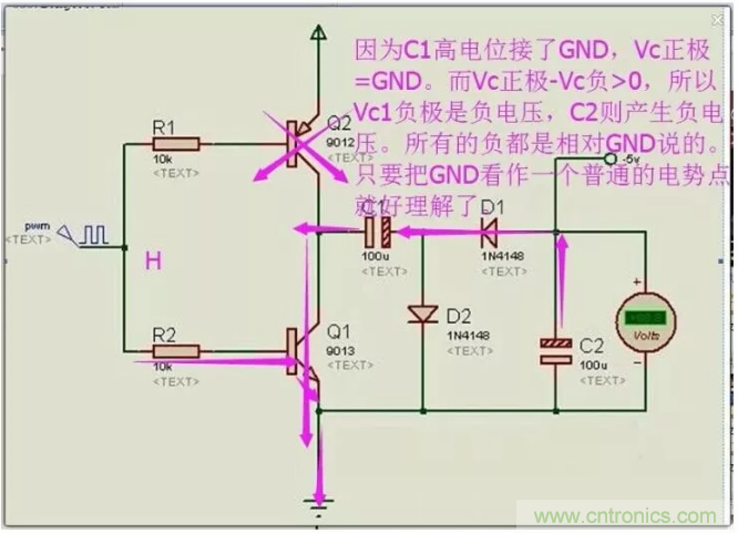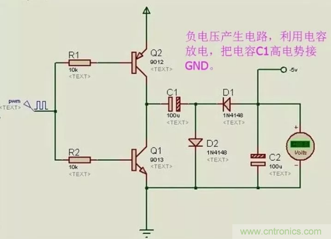 一個負電壓產(chǎn)生電路:利用電容充電等效出一個新電源,電容串聯(lián)在GND后,等效為電源2。則產(chǎn)生負電壓。