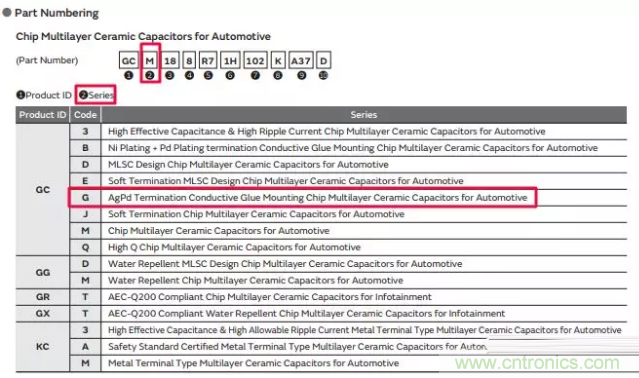 對(duì)于TDK的汽車(chē)級(jí)CGA系列的電容來(lái)說(shuō),環(huán)氧樹(shù)脂安裝的電容只在后綴上以一個(gè)字母"D"表示,這一般定義為“TDK內(nèi)部代碼”,并可以有其他字母如“A”、“B”、“C”、“E”等。