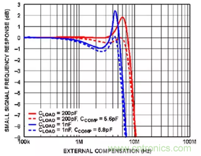 圖4:在單位增益、±110V供電電壓、VOUT = 100Vp-p、Rf = 0Ω 及 CCOMP = 5.6皮法 (pF) 時(shí),ADHV4702-1的小信號頻率響應(yīng)與外部補(bǔ)償?shù)年P(guān)系曲線圖。(圖片來源:Analog Devices)