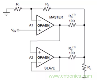 圖5:將兩個(gè)OPA454AIDDAR運(yùn)算放大器并聯(lián),可線性提升輸出電流能力。(圖片來源:Texas Instruments)