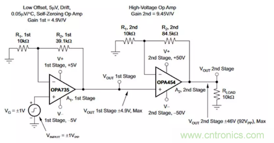 圖7:在OPA454的輸入路徑中加裝近零漂移運(yùn)算放大器OPA735,會(huì)生成一個(gè)輸入失調(diào)溫度漂移非常低的兩級高壓電路。(圖片來源:Texas Instruments)