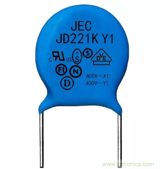 Y電容通常都是陶瓷類電容器,一般成隊出現(xiàn),多數(shù)是扁圓形外觀,顏色呈現(xiàn)藍色,能夠抑制共模干擾,Y電容容量是nF級。基于漏電流的制約,Y電容量不可很大。Y電容多數(shù)適用于隔離場合,按照IEC標(biāo)準,Y1產(chǎn)品電氣間隙最小為8.0㎜,Y2產(chǎn)品電氣間隙不低于6.3㎜,作為隔離產(chǎn)品,安全距離要做夠,避免高壓通電發(fā)生拉弧現(xiàn)象。