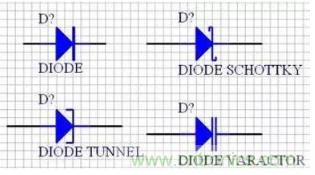 二極管的原理圖符號(hào)為“DIODE”,對(duì)應(yīng)的二極管的封裝為封裝屬性系列,如“DIODE-0.4”(小功率)到“DIODE-0.7”(大功率),其中0.4和0.7指二極管的焊盤間距,一般用“DIODE0.4”。值得一提的是,普通的發(fā)光二極管的元器件封裝為“RB.1/.2”。