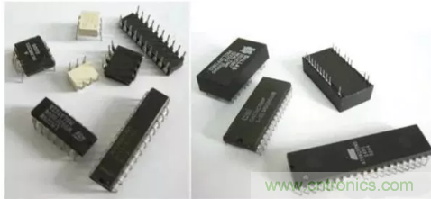 (b)元器件封裝 圖F1-19 常用的接插件 (8) 雙列直插式集成電路芯片。用戶在電路設(shè)計(jì)過(guò)程中,為了方便安裝和調(diào)試,在初次設(shè)計(jì)電路板時(shí)往往將許多集成電路芯片的選型定為雙列直插元器件(DIP)。圖F1-20所示為常用的雙列直插式集成電路芯片。