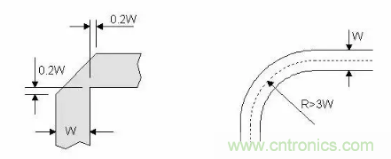 RF信號(hào)線如果走直角,拐角處的有效線寬會(huì)增大,阻抗不連續(xù),引起信號(hào)反射。為了減小不連續(xù)性,要對(duì)拐角進(jìn)行處理,有兩種方法:切角和圓角。圓弧角的半徑應(yīng)足夠大,一般來(lái)說(shuō),要保證:R>3W。如圖右所示。