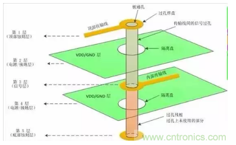 過(guò)孔是鍍?cè)陔娐钒屙攲优c底層之間的通孔外的金屬圓柱體。信號(hào)過(guò)孔連接不同層上的傳輸線。過(guò)孔殘樁是過(guò)孔上未使用的部分。過(guò)孔焊盤是圓環(huán)狀墊片,它們將過(guò)孔連接至頂部或內(nèi)部傳輸線。隔離盤是每個(gè)電源或接地層內(nèi)的環(huán)形空隙,以防止到電源和接地層的短路。