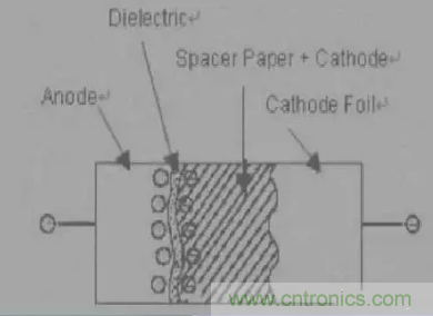 4. 陰極箔( Cathode Foil ):連接電解液和外部的層,這層在制作中并不需要氧化,但是在實際中由于在蝕刻過程中鋁容易被氧化,所以其形成了一個自然被氧化的氧化層,這個氧化層可以承受 1~2v 的電壓。