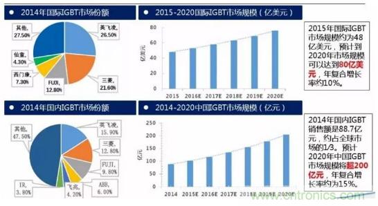 2015年國際IGBT市場規(guī)模約為48億美元,預計到2020年市場規(guī)??梢赃_到80億美元,年復合增長率約10%。2014年國內IGBT銷售額是88.7億元,約占全球市場的1∕3。預計2020年中國IGBT市場規(guī)模將超200億元,年復合增長率約為15%。