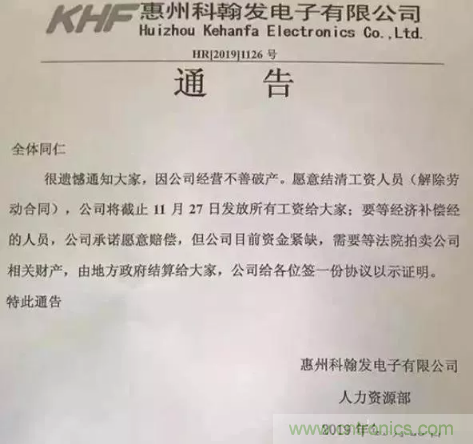 不僅僅是韓國LG因銷量下滑關(guān)閉PCB業(yè)務(wù),就在前幾日,PCB廠商惠州科翰發(fā)電子發(fā)出破產(chǎn)公告。公告稱,由于公司經(jīng)營不善導(dǎo)致破產(chǎn),和員工解除勞動合同并結(jié)清工資,將于11月27日發(fā)放薪資給大家,通告中特別說明公司愿意賠償給需要經(jīng)濟補償金的人員,只是由于公司資金緊缺,公司會和員工簽一份證明協(xié)議,待法院拍賣公司財產(chǎn)后由地方政府結(jié)算,也算是給員工一個交代。