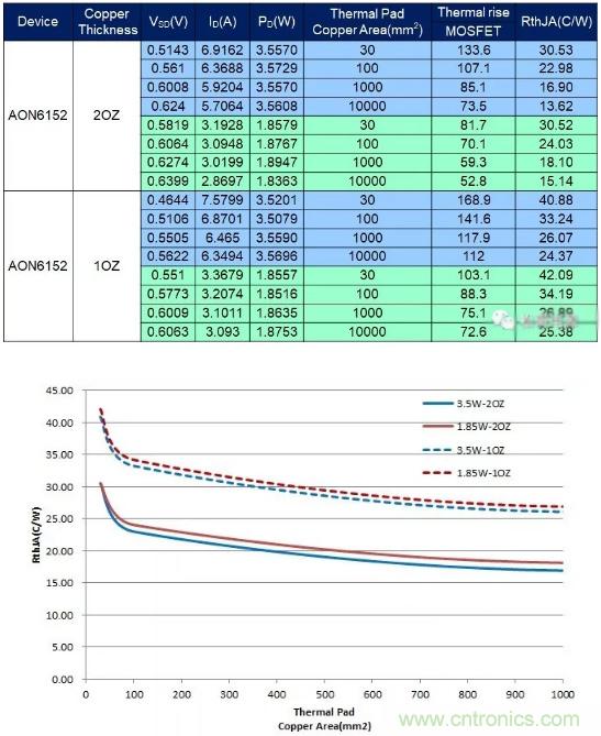 下面分別以一塊10cmX10cm、2OZ覆銅的二層PCB板來做試驗,板厚1.5mm,PCB底層覆銅沒有通過過孔連接到頂層,將封裝為DFN5*6器件AON6152焊接在PCB板,同時AON6152的D極下面分別鋪設(shè)四種不同尺寸的銅皮:30mm2、100mm2、1000mm2、10000mm2。然后給四塊板的AON6152灌入相同的功率,測量AON6152的溫升,計算相應(yīng)的熱阻RJA。將AON6152灌入功率減小一半,重復(fù)上面的實驗,測量其溫升,再次計算相應(yīng)的熱阻RJA。