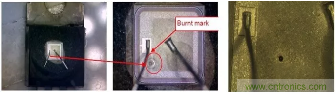 從失效的圖片,可以明顯的看到,功率MOSFET進(jìn)入線性區(qū)失效。