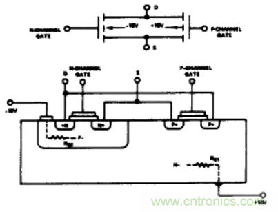 圖1是一個典型CMOS輸出開關單元的電路圖及截面圖。從不同單元和區(qū)域之間的連接關系中,我們可以畫出一個等效二極管電路圖(圖2)。如果在S端或D端的模擬輸人電壓超過電源電壓。