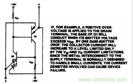 由靜電荷積累(V=q/C=1kV/nC/pF)而形成的靜電電壓帶來的危害可能擊穿柵極與襯底之間起絕緣作用的氧化物(或氮化物)薄層。這項危害在正常工作的電路中是很小的,因為柵極受片內齊納二極管保護,它可使電荷損耗至安全水平。
