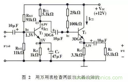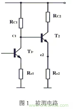 用同一臺(tái)測(cè)量?jī)x器進(jìn)行測(cè)量時(shí),測(cè)量點(diǎn)不同,儀器內(nèi)阻引進(jìn)的誤差大小將不同。例如,對(duì)于圖1所示電路,測(cè)C1點(diǎn)電壓VC1時(shí),若選擇e2為測(cè)量點(diǎn),測(cè)得VE2,根據(jù)VCl=VE2+VBE2求得的結(jié)果,可能比直接測(cè)Cl點(diǎn)得到的VC1的誤差要小得多。所以,出現(xiàn)這種情況,是因?yàn)镽e2較小,儀器內(nèi)阻引進(jìn)的測(cè)量誤差小。