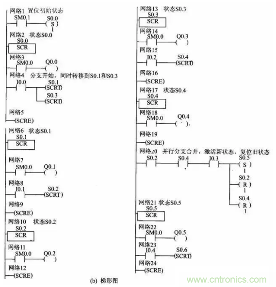 (6)在狀態(tài)發(fā)生轉(zhuǎn)移后,所有的SCR段的元器件一般也要復(fù)位。如果希望繼續(xù)輸出,可使用置位/復(fù)位指令。