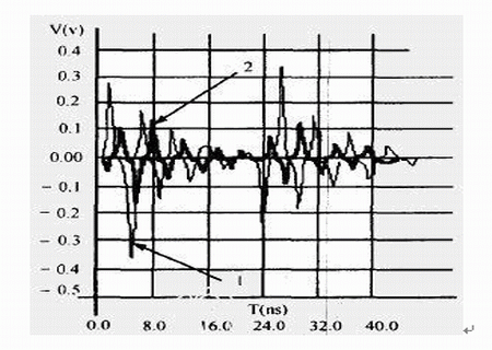 干擾源信號頻率越高,被干擾對象上的串?dāng)_幅值越大,我們對圖1中干擾源網(wǎng)絡(luò)AB上的信號頻率f1分別取不同頻率值時,對被干擾對象上的串?dāng)_進(jìn)行了仿真,仿真結(jié)果見表2,信號頻率不同時的串?dāng)_波形見圖5,標(biāo)記為“1”、“2”箭頭所指的波形頻率分別為“500MHz”、“100MHz”。
