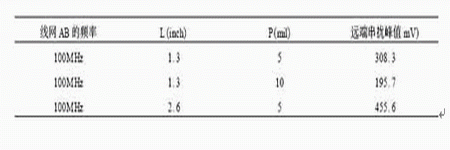 表3 兩線間距P和平行長度L取不同值時的串?dāng)_峰值