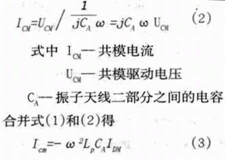 這里UCM就是產(chǎn)生共模輻射的驅(qū)動源。要產(chǎn)生輻射,除了源以外還必須有天線。這里的天線有兩部分組成,一部分是由A點向左看的地線部分,另一部分是由B點向右看的地線部分和外接電纜。其組成的輻射系統(tǒng)的等效電路如圖1(b)所示,這實際上是一付不對稱振子天線。流過天線的電流即為共模電流,可用下式表示