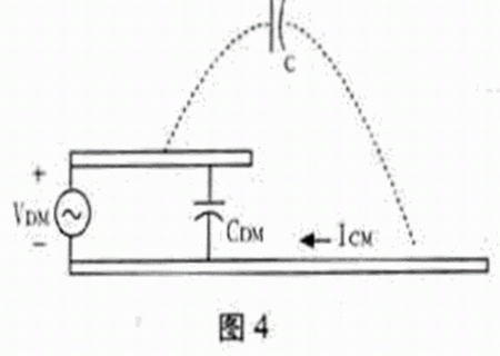 圖5是電壓驅(qū)動模式的一個實例。圖中Q是大功率的開關(guān)管,Q可看成是差模電壓源UDM,共模電流ICM的途徑是由Q通過開關(guān)管和散熱片之間的分布電容Cd到達散熱片,散熱片是共模天線的一個極。然后以空間位移電流的形式,即通過C A到達外部接線,外部接線是天線的另一個極,共模電流再由印制板地回到Q。