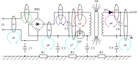 圖8是磁感應(yīng)產(chǎn)生傳導(dǎo)干擾的原理圖,圖8表示開關(guān)電源變壓器產(chǎn)生的漏磁通穿過其它電路時(shí),在其它電路中也產(chǎn)生感應(yīng)電動(dòng)勢(shì),其中漏磁通M1、M2、M3產(chǎn)生的感應(yīng)電動(dòng)勢(shì)e1、e2、e3屬于是差模干擾信號(hào);M5、M6、M7、M8產(chǎn)生的感應(yīng)電動(dòng)勢(shì)e5、e6、e7、e8屬于是共模干擾信號(hào)。