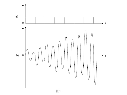 圖13是諧振回路產(chǎn)生諧振的工作原理圖。圖13-a)是一個(gè)含有諧波分量非常豐富的電壓方波,圖13-b)是LC串聯(lián)回路產(chǎn)生諧振時(shí)的電壓波形。當(dāng)電壓方波作用于LC串聯(lián)回路時(shí),方波的前后沿都會(huì)對(duì)LC串聯(lián)回路產(chǎn)生激勵(lì)(即接收能量),每次激勵(lì)過后又會(huì)產(chǎn)生阻尼振蕩(即損耗能量),當(dāng)輸入電壓波形的上升率dv/dt值大于諧振回路波形(正弦波)的上升率時(shí),電路就會(huì)產(chǎn)生激勵(lì);當(dāng)輸入電壓波形的上升率dv/dt值小于諧振回路波形的上升率時(shí),電路就會(huì)產(chǎn)生阻尼。
